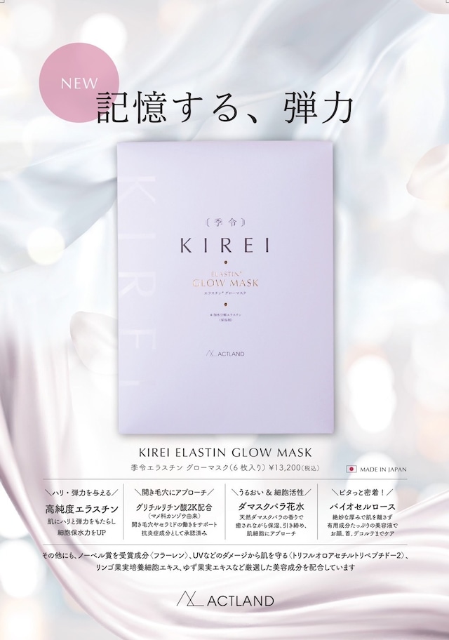 うるおいと透明感に満ちた”最高の肌状態を記憶する”バイオセルロース製のフェイスマスクです。 Point1 記憶×成分 圧倒的な浸透力で、肌に栄養を急速チャージ。 乾燥、しみ、しわ、毛穴、たるみなど肌の気になる悩みにアプローチし、最高の肌状態に整え、記憶させます。 Point2 記憶×素材 うるおいと有用成分をしっかりと肌に届けるバイオセルロース素材を採用。 密着性に優れ、肌を離さない構造だからこそ、目元や小鼻までしっかりケアし、翌朝の肌の違いを実感いただけます。 【高純度エラスチン】 細胞保水力を底上げし、肌にハリと弾力をもたらします。 【グリチルリチン酸2K(マメ科カンゾウ由来)】 抗炎症成分として認証されており、開き毛穴やセラミドの働きをサポートします。 【ダマスクバラ花水】 貴重な天然ダマスクバラのフローラルウォーターを使用。 芳しい香りに癒されながら、お肌を保湿し引き締めます。 【リンゴ果実培養細胞エキス】 抗酸化作用が強く、肌の老化を予防します 【ゆず果実エキス】 高い保湿効果で、バリア機能やターンオーバーの正常化を助けます。 洗顔後の清潔なお肌にお使いください。 30分程度おいてから外し、 乳液やクリーム等はマスクの後にお使いください。 ※マスクは2枚のメッシュで保護しています。保護シートをはがしてからお使いください。 〈スキンケアの順番〉 ①季令ローズクレンジング ②季令eトナー ③季令エッセンス ④季令グローマスク ⑤季令モイスチャーゲル ⑥季令eクリーム